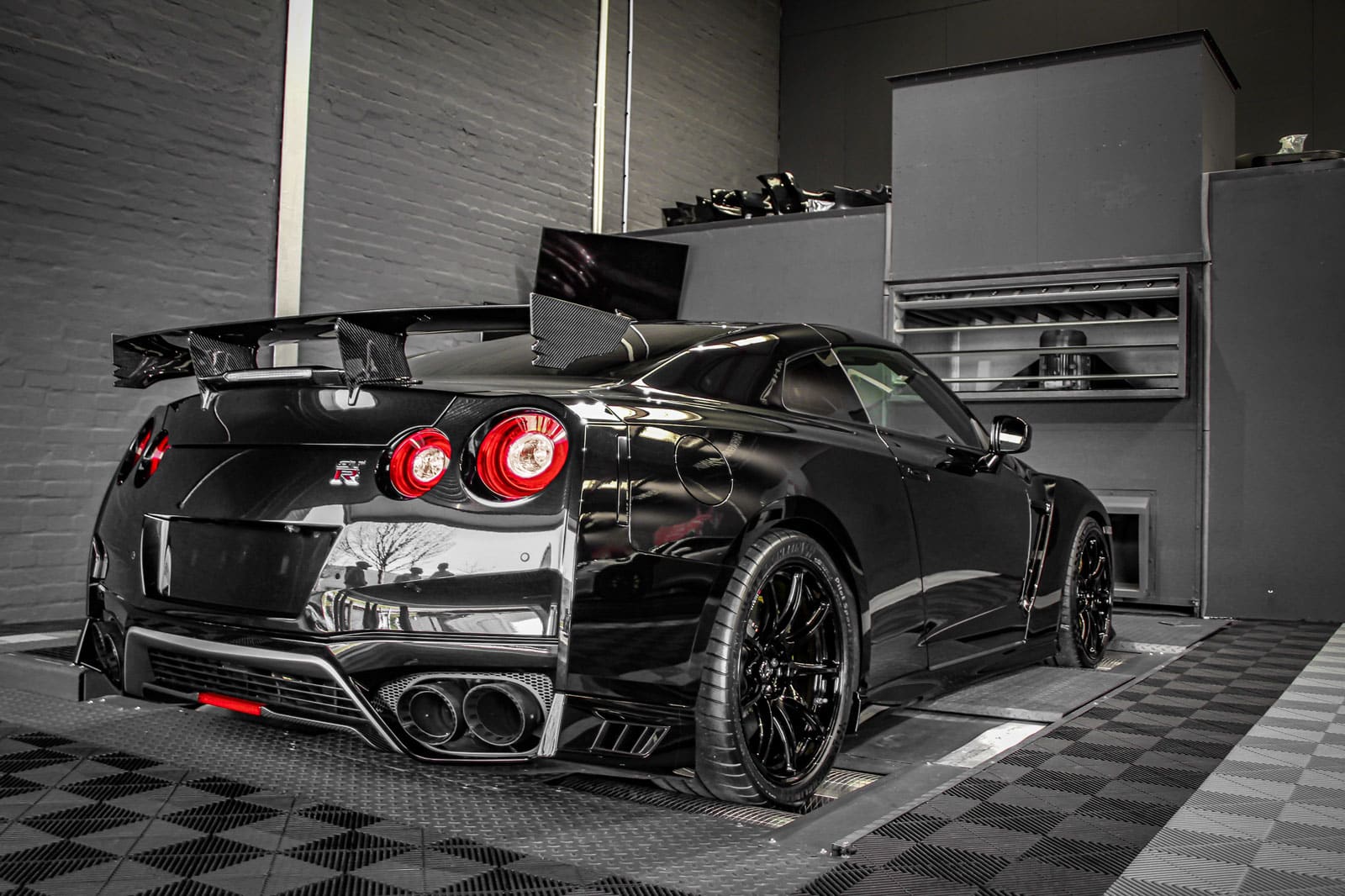 Schwarzer Sportwagen mit großen Felgen und Heckspoiler auf einem Leistungsprüfstand.